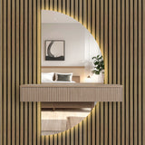 De zwevende kast biedt praktische opbergruimte voor dagelijkse essentials zoals sleutels, parfum of accessoires, zonder afbreuk te doen aan de rust van het ontwerp. De halfronde spiegel zorgt voor een elegante balans aan de muur en reflecteert het licht op een subtiele manier, waardoor de ruimte optisch groter en lichter oogt.